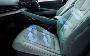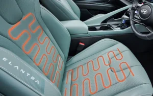 The ELANTRA’s front seats are leather-trimmed, heated, and ventilated for all-season comfort, while the power-adjustable driver’s seat with lumbar support ensures an ergonomic fit. Spacious rear seats offer generous legroom, and the use of eco-friendly materials complements the car’s commitment to sustainability. The soft-touch finishes create a refined, cozy environment, making each drive luxurious and environmentally conscious.